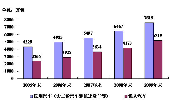 據(jù)公安部交通管理局最新消息,截至2009年底,我國汽車保有量已達到6200萬輛。如果把三輪汽車、低速貨車、農(nóng)用車包括在內(nèi),截至2009年底,我國民用汽車保有量已達7619萬輛,比上年末增長17.8%。其中私人汽車保有量5218萬輛,增長25.0%;民用轎車保有量3136萬輛,增長28.6%,其中私人轎車2605萬輛,增長33.8%。